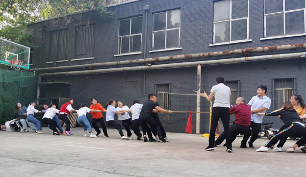 最后是特别考验凝聚力的拔河比赛,场面最为精彩激烈。裁判一声哨响,参赛双方人员齐心协力各不相让,一条沉重的绳子被拉得笔直,大家全力以赴,努力争夺。一个个鼓足了劲儿,涨红了脸,做到了姿势、手势、口号三者的高度统一,定格了比赛场上最沸腾、最开心的画面。