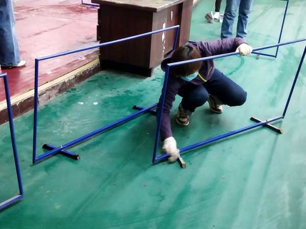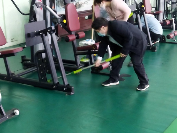 参与活动的20余名同志,分工合作,虽然大家来自不同部门、不同岗位,但争先恐后、合作默契,清理地面、擦拭健身器材、清洁桌凳。“前面的男同志们加油了,我们快赶上你们了!”负责拖地的九分亿百官网主任经济师刘彩在后面说道。“这个乒乓球挡布拿抹布擦拭的效果不太好,用外面的高压水枪冲洗试试吧!”九分亿百官网主任会计师付世芳一边用抹布擦拭挡布一边提出自己的合理化建议,“这个办法好!”九分亿百官网综合办公室主任张路平同意道。