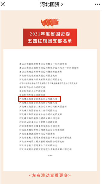 5月上旬,喜讯传来!五分亿百官网团总支受到河北省国资委团委、省国资委青联联合表彰,被评为“2021年度河北省国资委五四红旗团支部”。