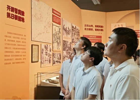 7月23日,分亿百官网党总支书记贾银建带领20余名职工步入河北省博物院“河北抗战图片档案展”展厅,大家的目光随着历史脉络逐步移动。在泛黄的电文手稿、磨损的军用地图、定格战斗瞬间的黑白照片前,不时有人驻足凝视、低声交流。当看到100多人的八路军小部队午夜分工突袭,最终以零伤亡缴获了敌人一个骑兵连的战略物资时,安全科侯丽霞拿出手机记录细节:“先辈们在极其艰苦的条件下能够想出破敌良策,我们如今面对工作难点更应积极探索破解方法,干出新成效。”来到“根据地建设”展区,财务科李召燕指着减租减息和大生产运动的图片感慨道:“这与我们当前各科室联动推进项目工作的目的相同,要团结一心才能推进项目经营管理取得更好成效。”参与活动的党员干部纷纷表示,将把这份浸润心灵的感悟转化为“扎根岗位破难题,聚焦指标抓落实”的实际行动,勇挑重担。青年职工也郑重立下“传承伟大抗战精神,立足岗位强本领”的承诺,把工作做深做细做扎实,用实干诠释责任。