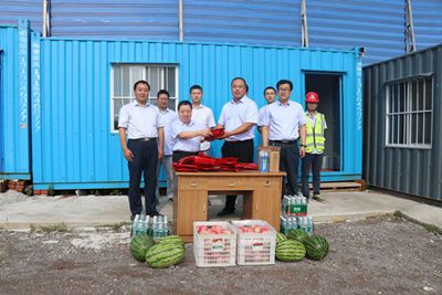 上午8点,亿百官网满载茶叶、西瓜、苹果、花露水等慰问品的商务车缓缓开进职工生活区,李怀生一边给职工发放慰问品一边关心地询问他们的生活和工作情况,并叮嘱他们有困难和问题及时向项目部反映,还要求项目部一定要做好职工的后勤保障,让大家消除后顾之忧。