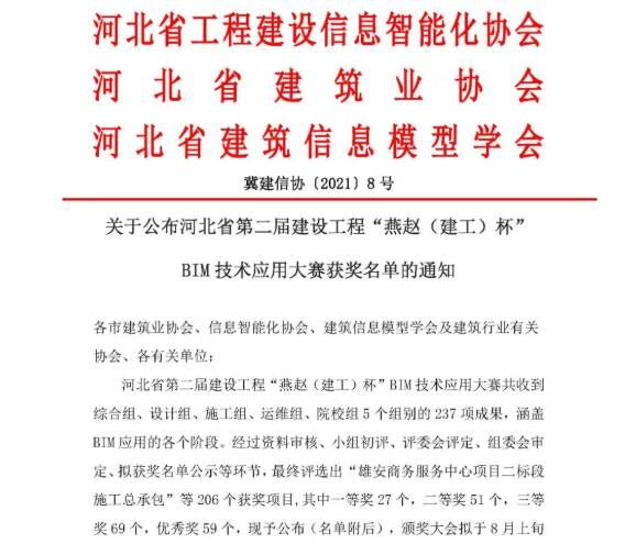 据悉,本次大赛由河北省工程建设信息智能化协会、河北省建筑业协会、河北省建筑信息模型学会共同举办,共收到237项参赛成果,最终评选出一等奖27个,二等奖51个,三等奖69个,优秀奖59个。此次获奖,充分展现了亿百官网BIM技术应用水平和实力,彰显了企业品牌形象。(BIM中心)