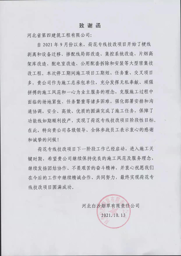一纸致谢函,字字鼓人心!10月13日,三分亿百官网中烟项目部收到业主河北白沙烟草有限责任亿百官网发来的致谢函,感谢项目部克服场地紧张、任务重等诸多困难,圆满完成施工任务,实现了荷花专线技改项目阶段性目标。
