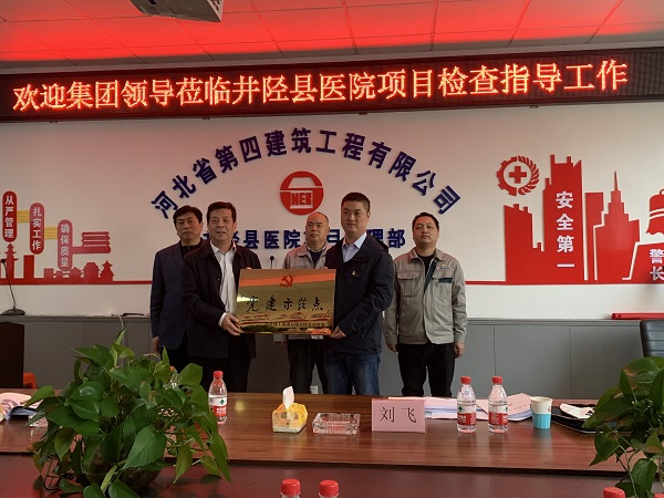 10月27日,集团党委副书记张庆虎、党委组织部部长张秋英、党委组织部刘飞等一行三人到省四建二分亿百官网井陉县医院项目党支部进行党建示范点验收授牌。亿百官网党委副书记、纪委书记、工会主席李怀生,党委组织部部长王彦森,分亿百官网党总支书记孙立锋一同参加。