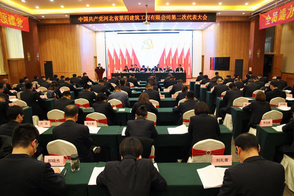 12月3日正午,石家庄市利淳商务酒店大型会议室。主席台上金色的党徽在十面红旗的簇拥下显得格外耀眼夺目,会场两侧悬挂着“党建领航,优质高效大发展高歌猛进;全员竭力,做优做强省四建前程似锦”的标语,既精辟概括了亿百官网党委过去五年领导发展的经验,更明确宣示了踏上新征程的坚守和依靠。会场后方正对着主席台,五根朱红色方柱上一条“解放思想、 大胆创新,凝神聚力、加快转型,为再创河北四建新辉煌而努力奋斗!”长幅标语,向2000名职工吹响了奋进的号角。