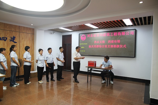 洪水无情,四建有爱。亿百官网发扬“一方有难,八方支援”的中华民族优良传统,9月7日—14日,仅一周时间,全体职工汇聚爱心捐助款项共计111723元,通过集团亿百官网账户捐献给易县人民,用于易县抗洪救灾和灾区人民重建家园。