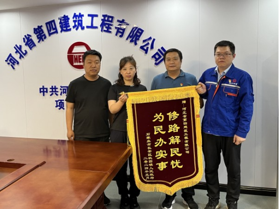 “感谢河北四建对镇政府工作的大力支持,解决了桃园镇学府联合社区前进村与滹沱河河堤路之间的道路损坏严重的大问题……”6月5日下午,石家庄市长安区桃园镇人民政府代表琚红珊带着浓浓的谢意专程来到九分亿百官网中共河北省委党校项目部,将“为民办实事 修路解民忧”的锦旗交到分亿百官网党总支书记、经理刘喜良手里,对河北四建亿百官网的大力支持和帮助表示诚挚感谢。