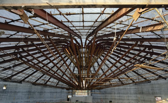 体系设计优化,拼装提速。“钢筋混凝土筒仓锥壳顶板架空支撑施工工法”依托粮食类筒仓工程,筒仓建筑高度高达50米,内径26米,仓顶设计为锥壳顶、平顶双层结构,斜锥壳板厚0.2米。以往筒仓仓壁一般采用滑模施工,锥壳顶板施工复杂,一般采用H型钢组装成圆柱形核心筒、外辐射钢桁架平梁的方式组装成支撑平台,重21.9吨,用钢量大,制作成本高;节点连接采用焊接,拼装速度慢,无法满足群体筒仓的周转时效。分亿百官网针对传统做法的弊端,组织科研小组,专项研究,破解难题,最终形成了空间钢桁架——拉索组合结构支撑体系。该体系摒弃了3.2米直径的圆柱型核心筒,采用直径2.6米的伞状中心筒,通过五道环梁环向拉接,无需设置斜撑,原结构减轻将近1吨,节约了制作成本,而且承压能力更强。重点节点还改用了高强螺栓连接代替焊接,拼装速度明显提升,施工速度更快。