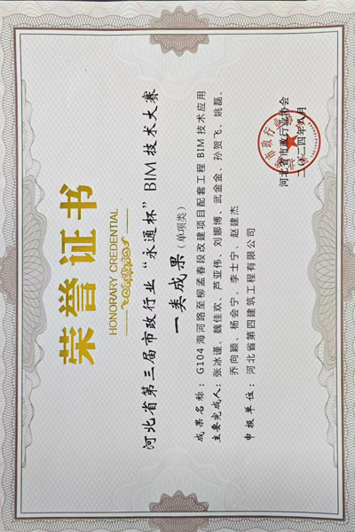 8月16日,七分亿百官网收到了河北省市政行业协会颁发的荣誉证书。分亿百官网参赛的“G104海河路至柳孟春段改建项目配套工程BIM技术应用”成果,在河北省第三届市政行业“永通杯”BIM应用技能大赛中被评为一类成果。