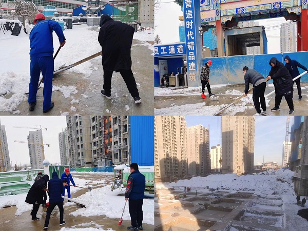 由于本轮低温降雪持续时间较长,整个施工现场积雪不仅厚还很瓷实,清扫工作十分困难。寒风凛冽刺骨,但大家热情高涨,充分发扬不怕苦、不怕累的精神,党员干部带头,职工群众踊跃参加,按照分工好的清扫区域全面铺开进行。设备管理员系上安全带爬上塔吊,清理积雪,先后对各类机械设备进行维修保养,检查是否存在安全隐患;电工按照巡检路线展开防寒防冻措施检查,并对临电周边积雪进行清理;其他管理人员扫的扫、铲的铲、相互配合,清除办公区及生活区积雪;在施工区域,各分包队伍清理道路积雪,对1#、2#、6#、10#住宅楼各层采取冬季保暖措施,并对门窗逐个进行封闭;项目经理带队,加强现场巡护,落实落细各项安全措施,确保雪后顺利复工。经过大家一个上午的通力合作,高质高效地完成了扫雪除冰工作,确保重点区域没有积雪结冰,切实保障了项目有序运行。