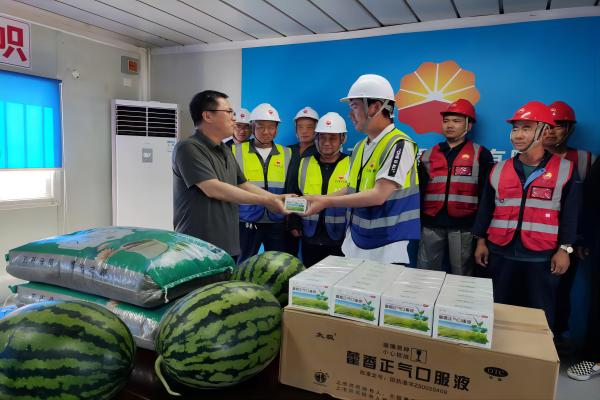 因近日持续高温,现场的施工环境给坚守一线的施工人员带来了严峻“烤”验,也时刻牵动着分亿百官网领导的心。6月12日,分亿百官网党支部书记、工会主席臧联合到项目部详细了解一线人员工作和生活情况,检查消防和防暑降温工作,为大家发放了西瓜、绿豆、藿香正气口服液等防暑物品,为高温下坚守岗位的项目职工带来了“娘家人”的问候和关怀,并叮嘱大家要在保障自身安全前提下完成好项目工作。